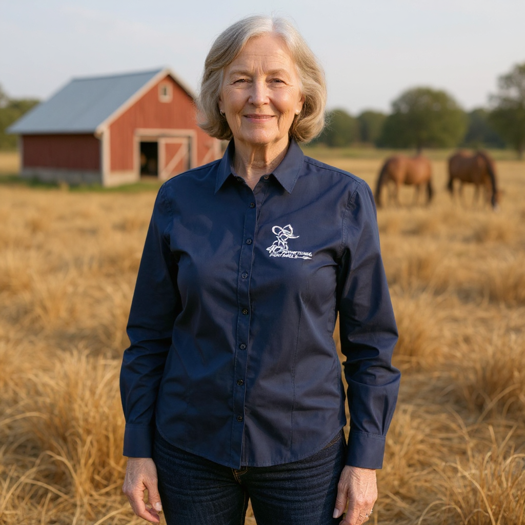 Sharp, timeless, and effortlessly western-chic—this crisp poplin shirt is a wardrobe staple for every cowgirl. Designed with a flattering tailored fit, button-down front, and embroidered detail that adds just the right pop of 40SC personality.
