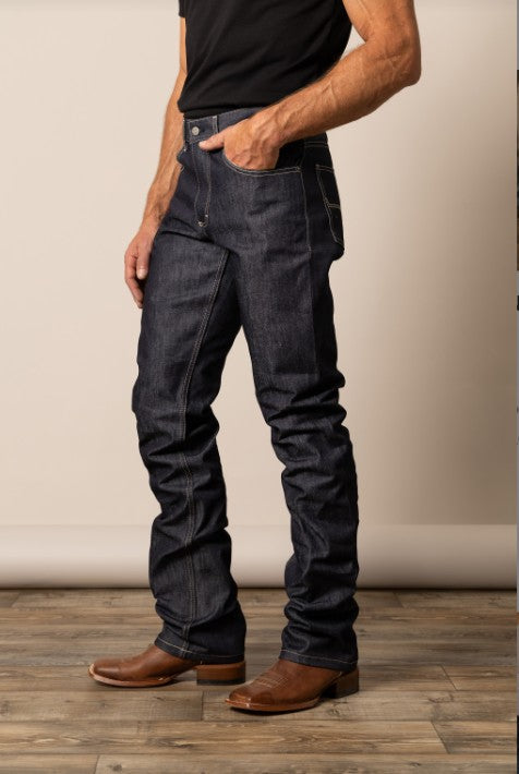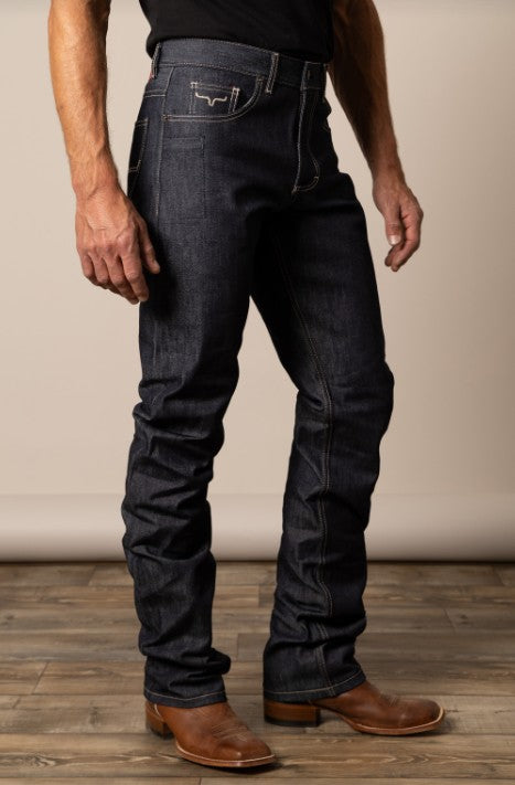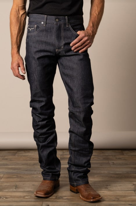 The mid-rise waist sits comfortably, while the straight-leg design delivers a sharp, refined silhouette whether you’re in boots, on the job, or headed out for the night. Heavyweight stitching, signature Kimes horn-pocket detail, and a dark unwashed finish keep the look crisp and timeless.