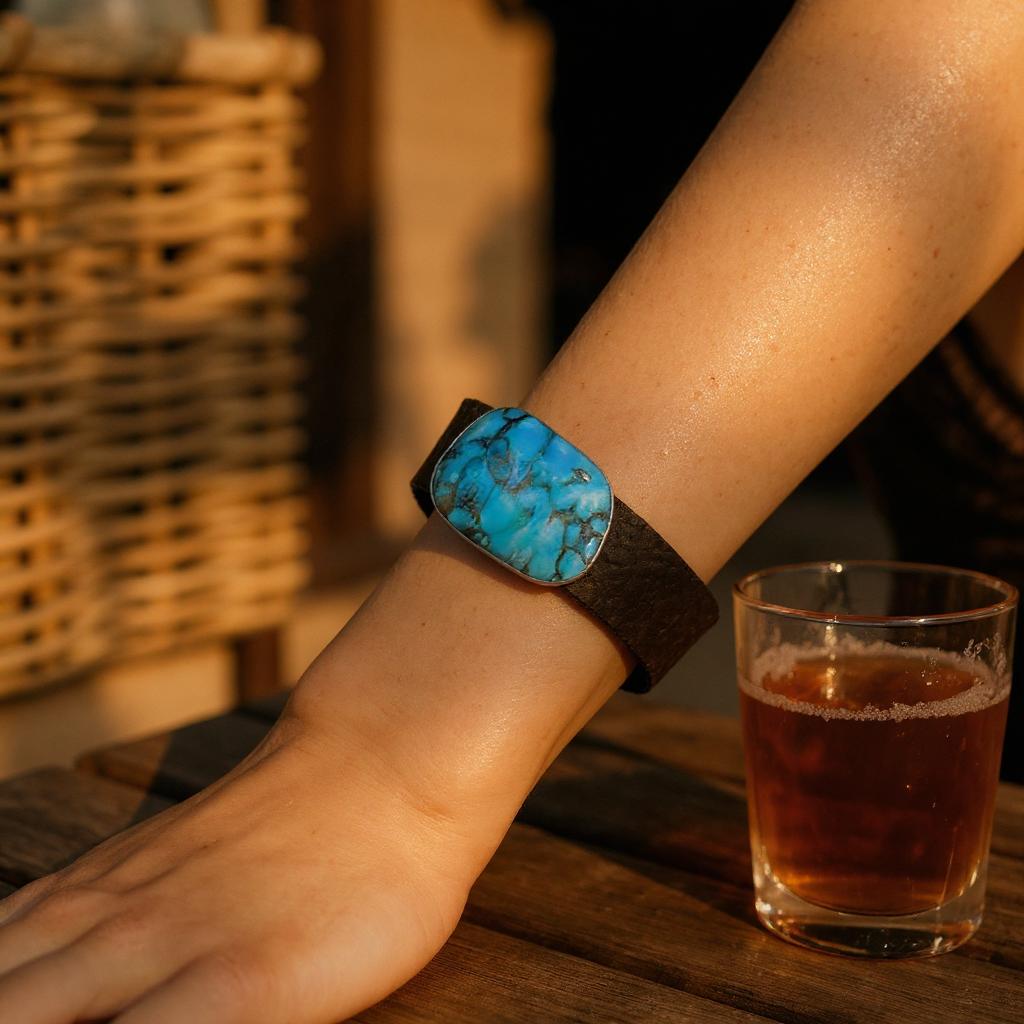Inspired by wide-open skies and wild country roads, the Turquoise Range Bracelet brings a bold western spirit to your wrist. Featuring a striking turquoise-style stone set on rugged leather, this snap bracelet is equal parts earthy and elevated.
