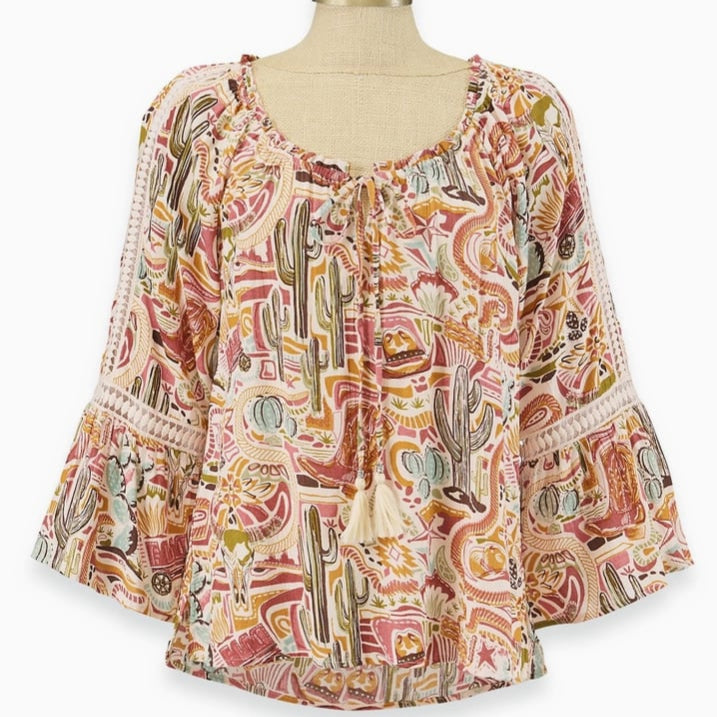 🌵 Make a bold statement with the Western Dream Print Blouse — a flowy, carefree top that celebrates desert sunsets and cowgirl spirit. Featuring a vibrant all-over western print with cacti, stars, boots, and desert scenes, this blouse is a true standout piece. The bell sleeves and tassel tie neckline add just the right touch of boho flair.